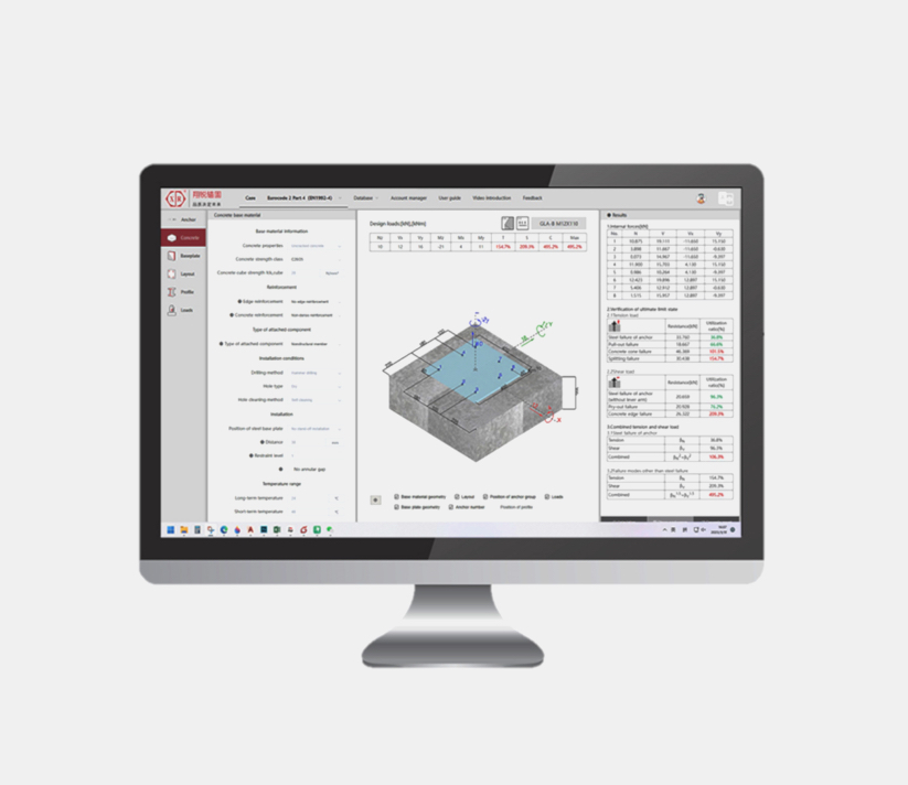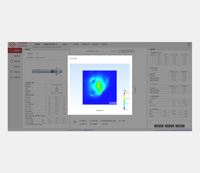 El software es una herramienta diseñada y desarrollada independientemente por la empresa Xiangrui para el diseño y cálculo de pernos de anclaje, que incluye principalmente la simulación del diseño de los pernos de anclaje y las condiciones de tensión, una interfaz gráfica tridimensional, un análisis de fuerza de elementos finitos de la placa de anclaje y el anclaje. perno, cálculo matemático de la capacidad de carga del perno de anclaje e instrucciones de uso e instalación, etc., para realizar todo el proceso de diseño del perno de anclaje desde la selección, diseño, cálculo de fuerza interna, verificación de la capacidad de carga hasta las instrucciones de construcción e instalación. Los usuarios no solo pueden comprender directamente los resultados del diseño y cálculo de los pernos de anclaje en la interfaz de diseño, sino también imprimir el informe de cálculo según sea necesario para la presentación del diseño, revisión, orientación de construcción, etc.
